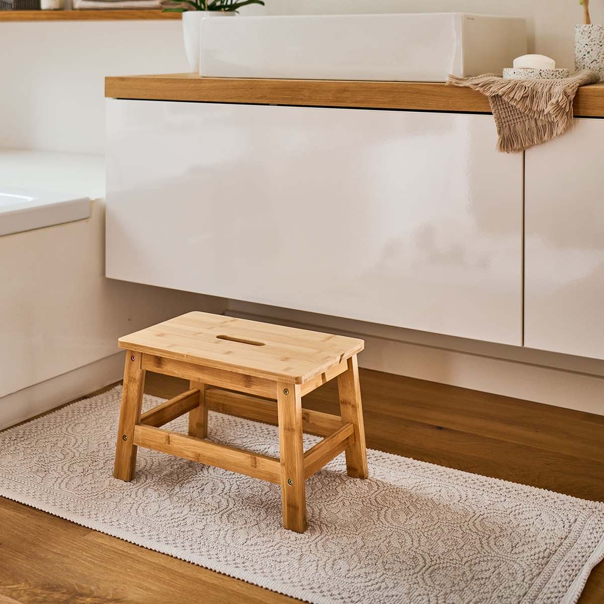 Skammel i bambus. En lav skammel du kan bruge som hjælp når du skal op i højden eller som lille afsætningsplads på badeværelset, i soveværelset eller køkkenet.