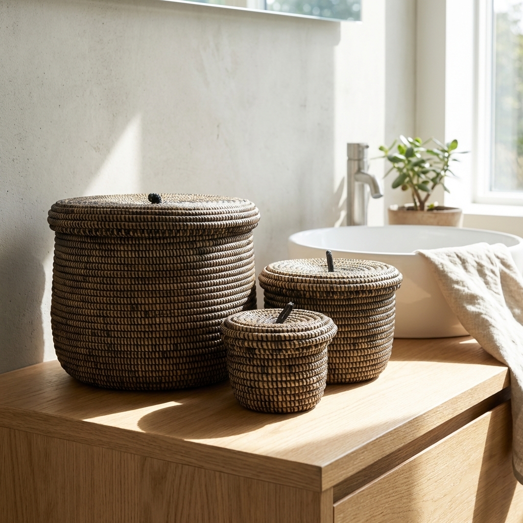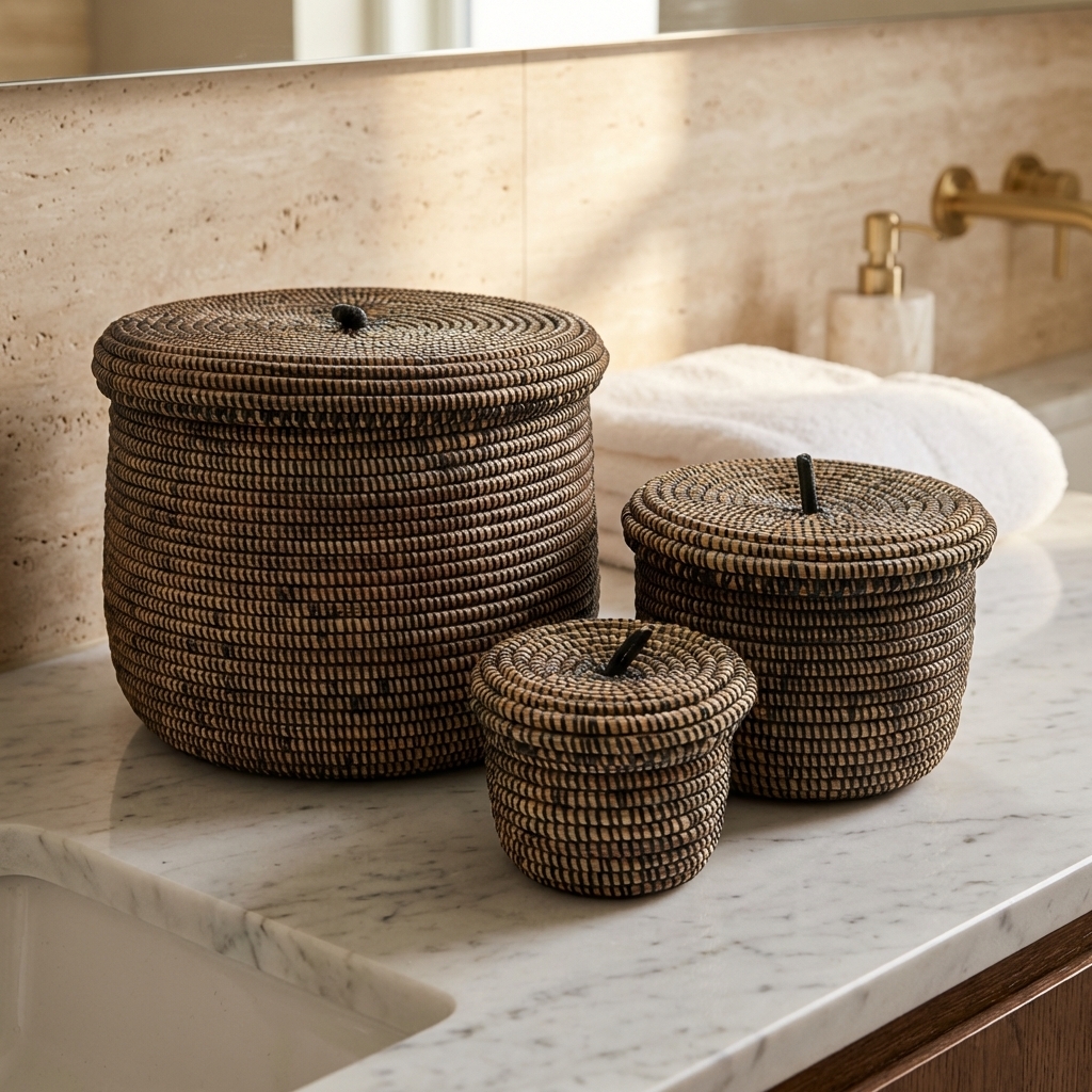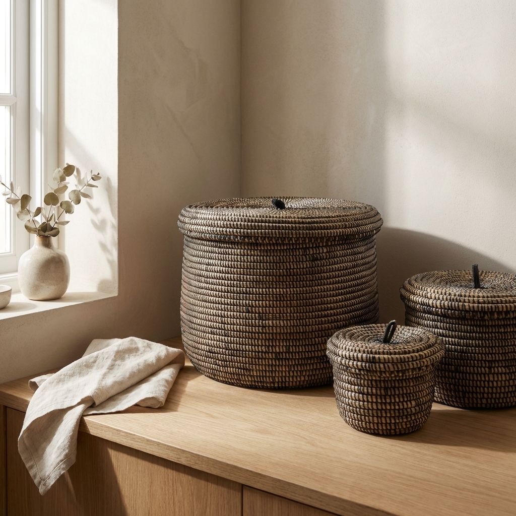 Sæt med tre små afrikanske kurve håndflettede i Senegal. Denne udgave har sorte plaststrips flettet ind i mellem naturmaterialet.