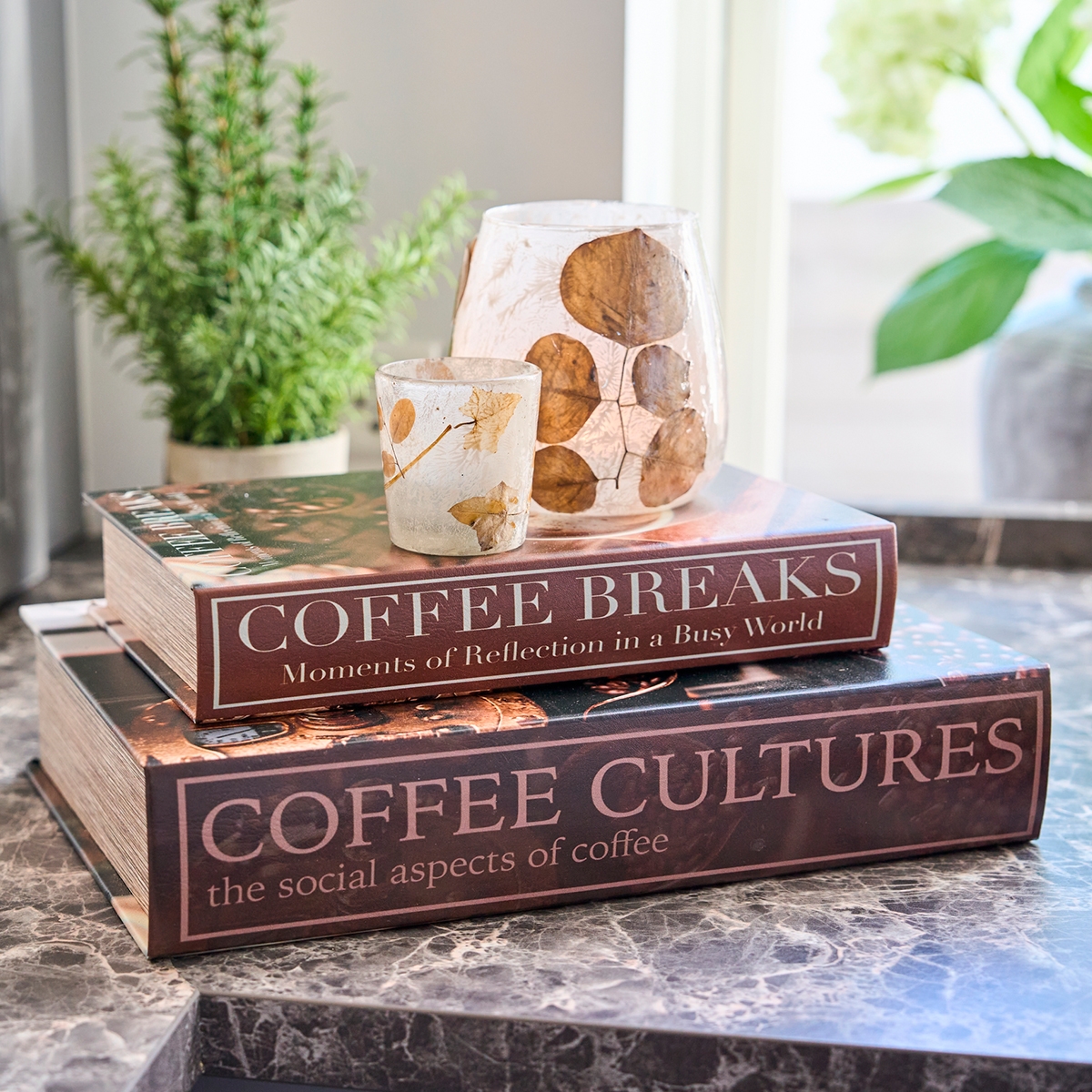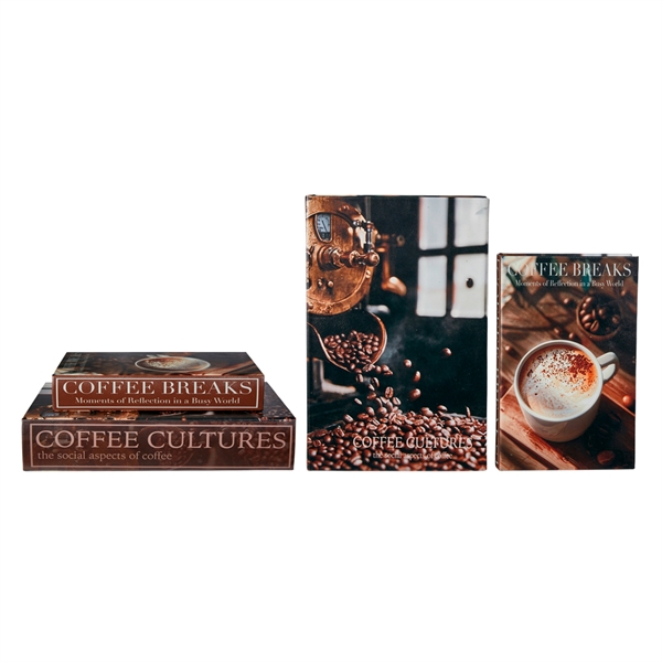 Sæt med 2 stk bogæsker fra Speedtsberg. Æsker der ligner bøger, men er hule indeni, så du kan gemme skatte eller de dagligdags ting du ikke vil have stående fremme som fjernbetjeninger, lighter, oplader osv. Disse to er med motiver som på billederne og tekster om kaffe på bogryggen.