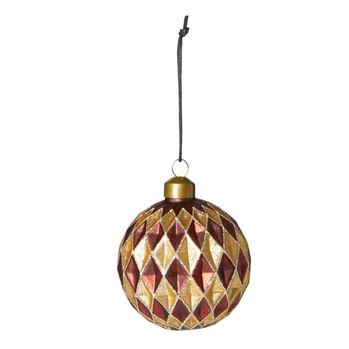 En smuk og dekorativ julekugle i glas med smukke glimmer detaljer i en flot julerød og guld nuance.