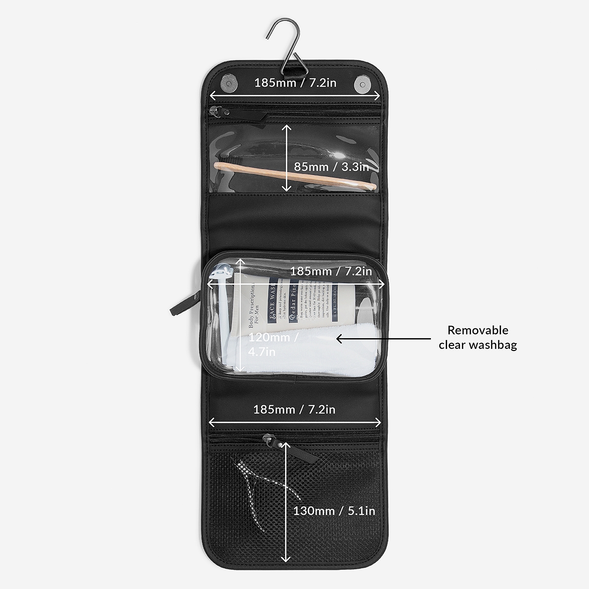 Toilettasken har to store rum til at organisere og en aftagelig klar lille taske i midten.