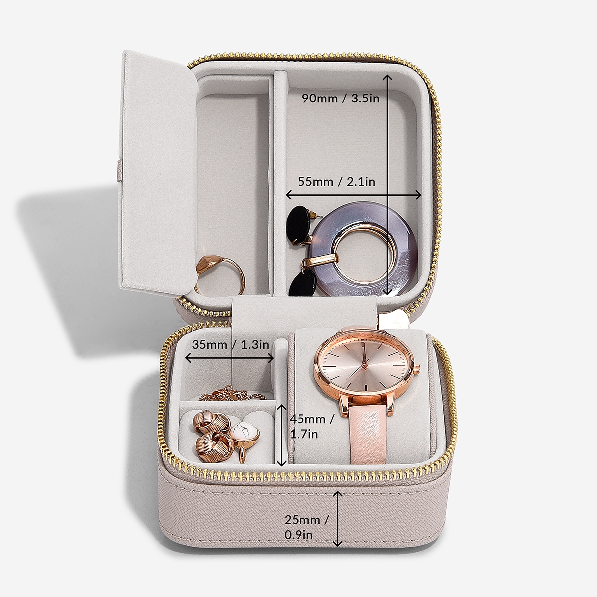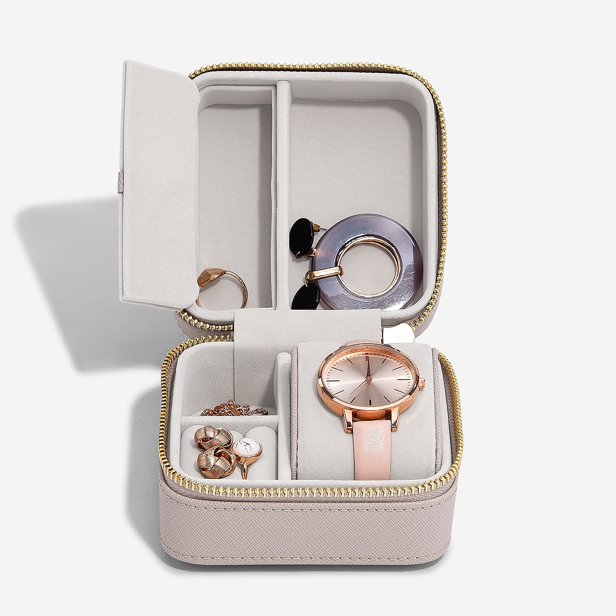 Etui til dit ure og nogle smykker, når du f.eks. er ude at rejse. Firkantet boks med lynlås. Indeni er en pude til dit ur i blødt velour. Ved siden af er der små rum til dine mest brugte smykker.