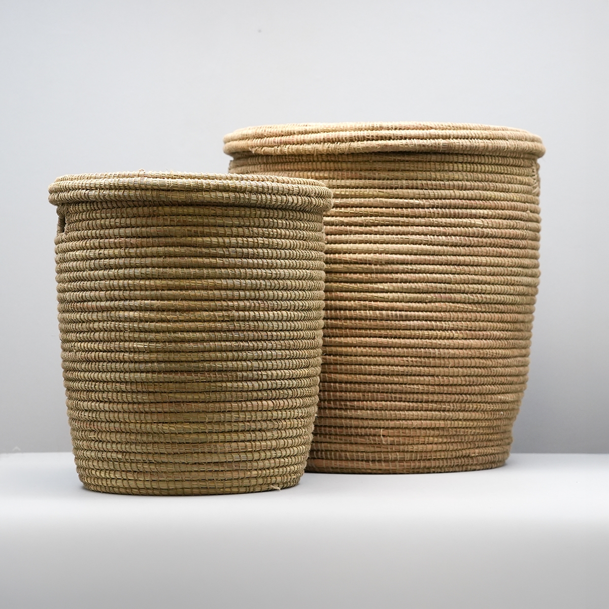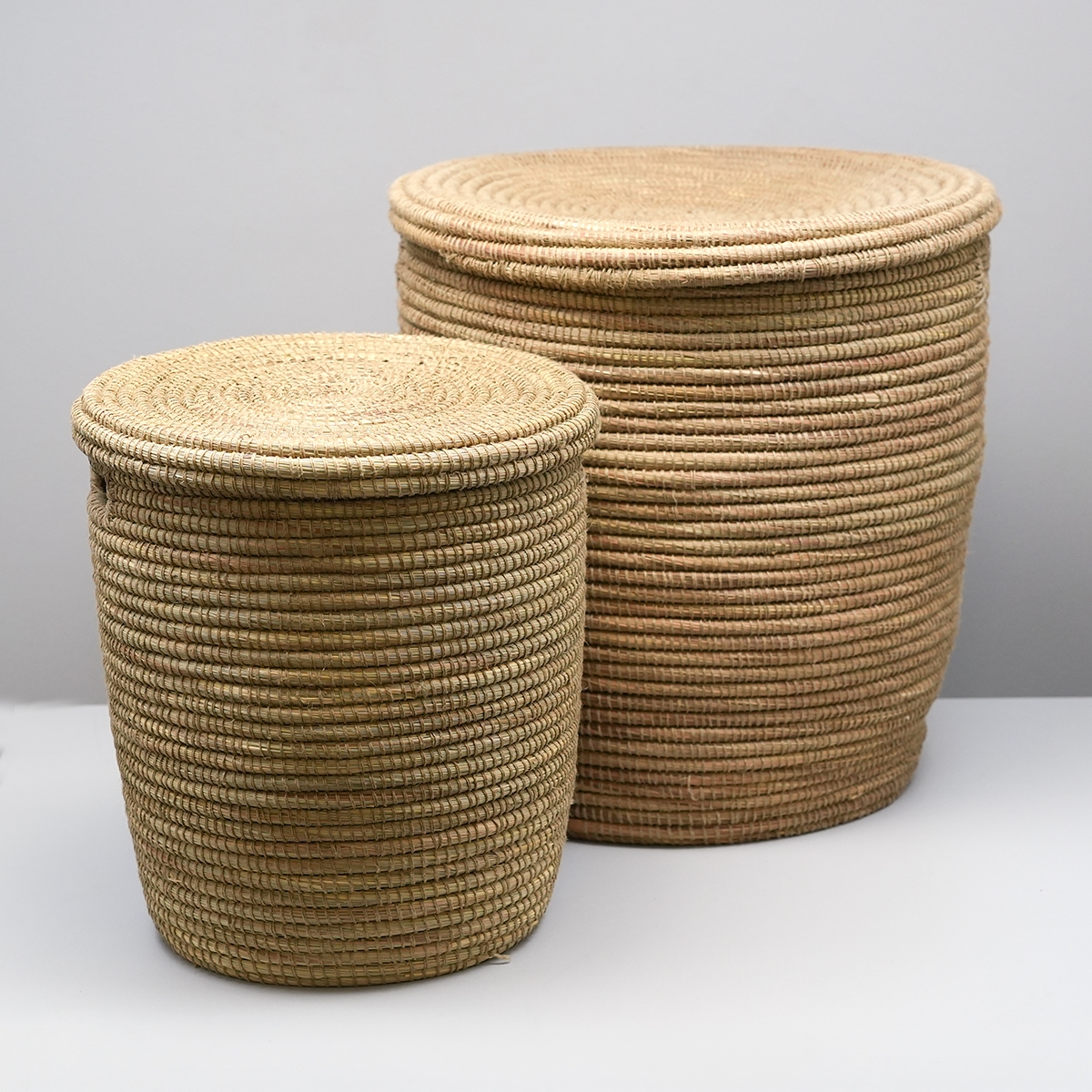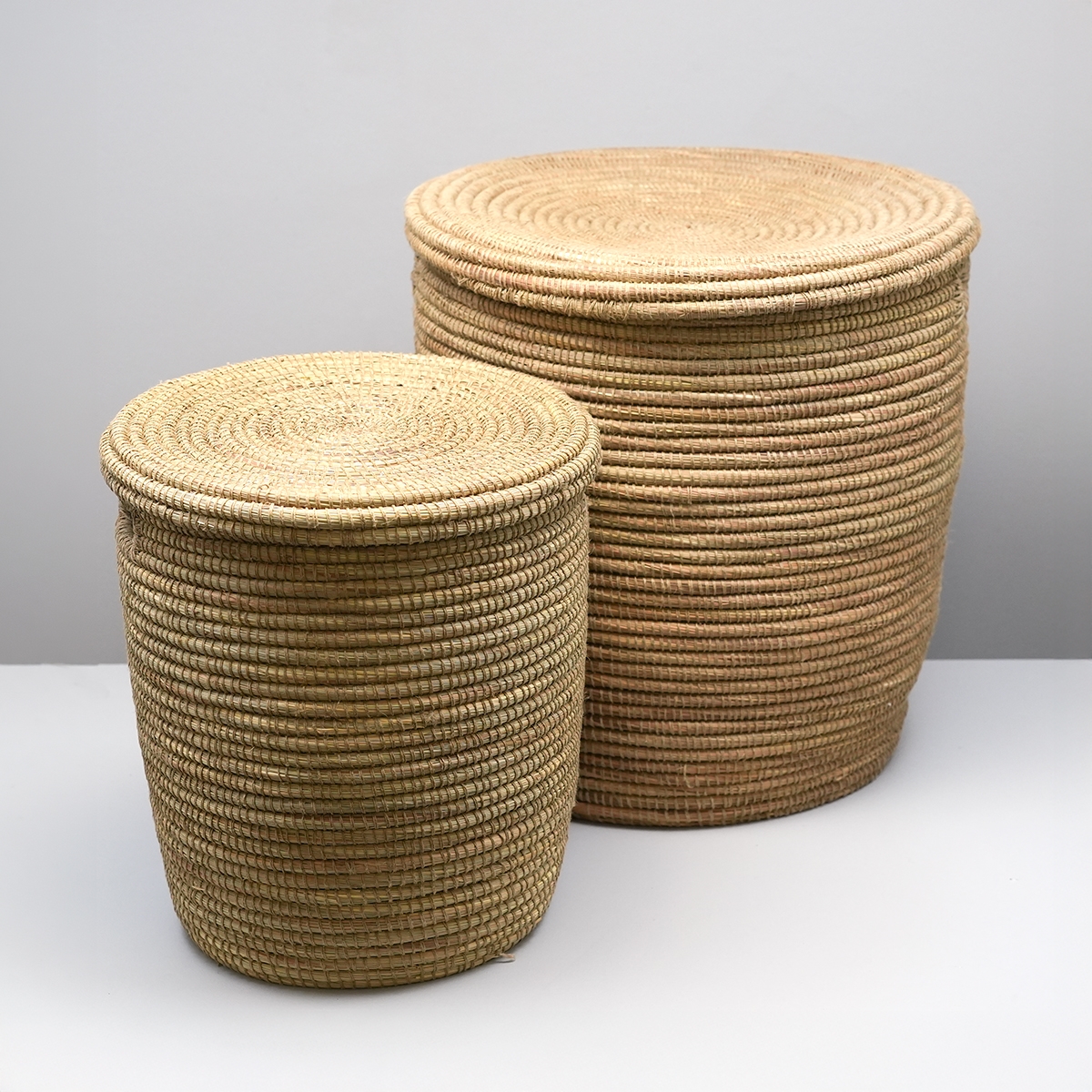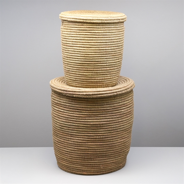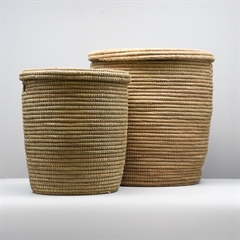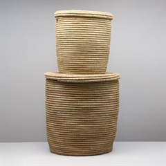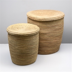 Sæt med to store afrikanske kurve med fladt låg. I samme materiale som de kendte Alibabakurve, denne model bare med fladt låg.