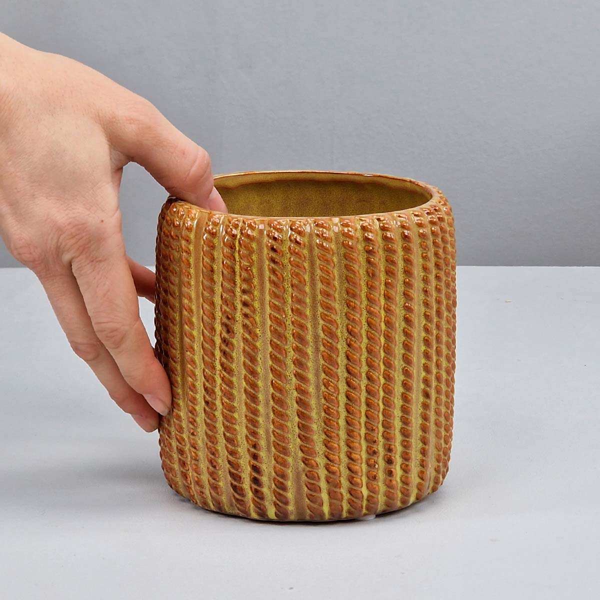 Håndlavet urtepotteskjuler i keramik med et "snoet" design i en gul og brun glasering. En dejlig varm farve til hjemmet.
