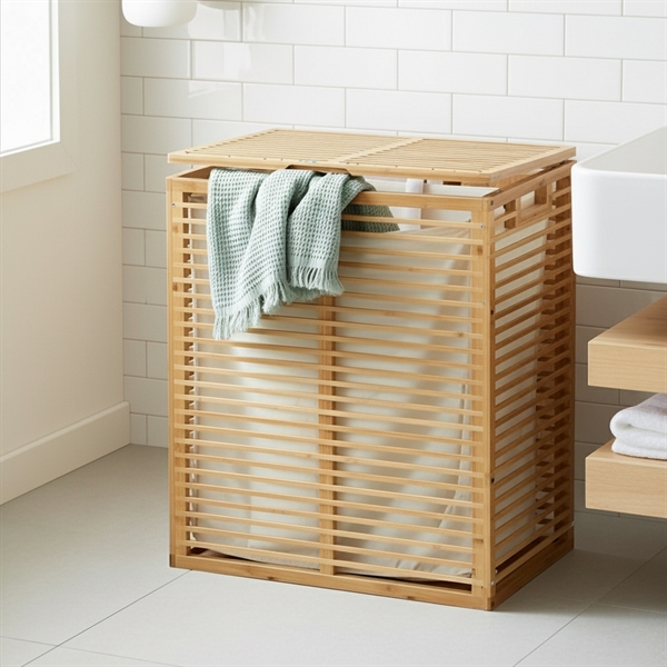 Stor firkantet vasketøjskurv i bambus med pose i kanvas.