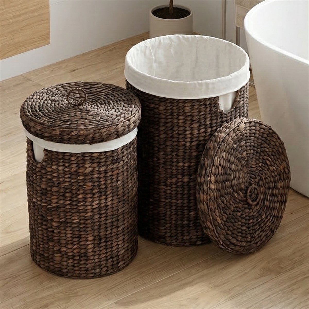 Mørkebrune vasketøjskurve med låg, lavet i lækkert mørk i vandhyacint. Kurvene er fra svenske Dixie.