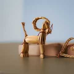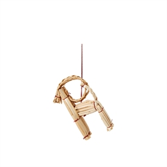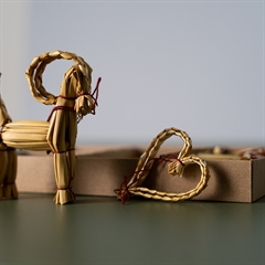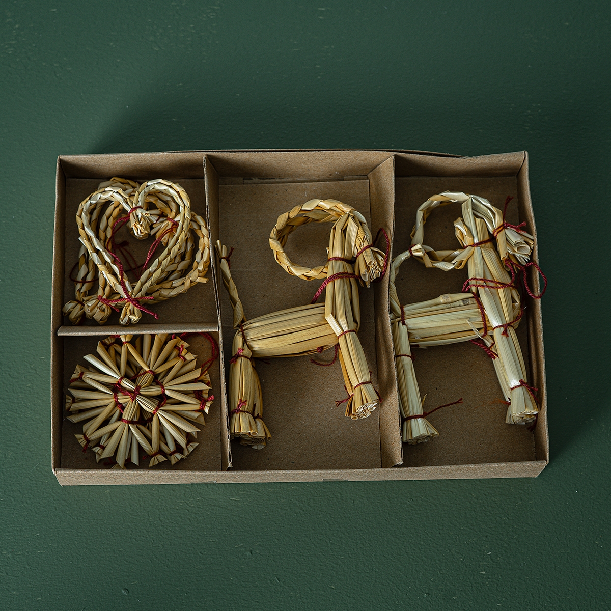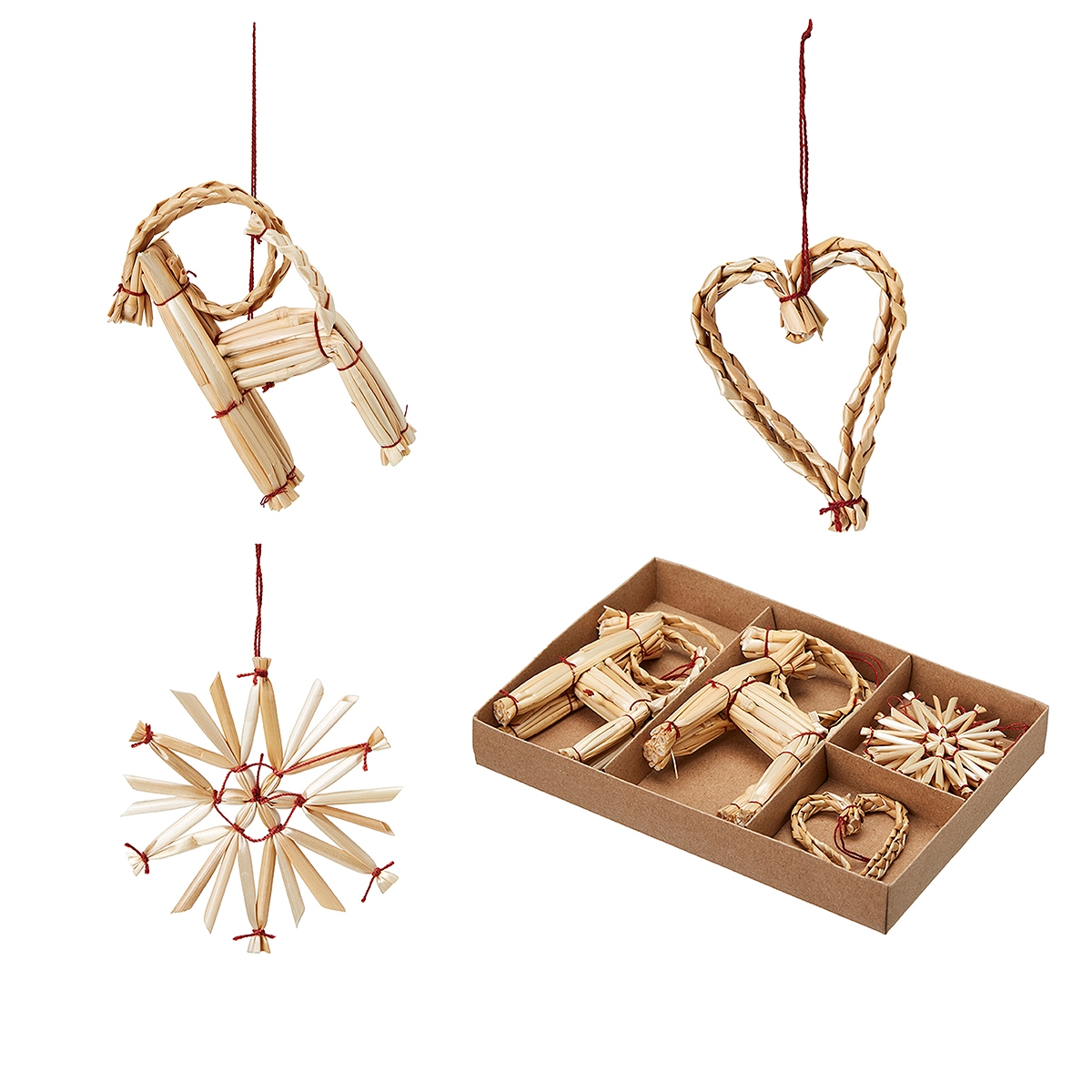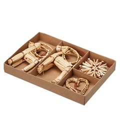 Pakke med ophæng i halm fra Wikholm. Klassisk julepynt i halm der ligger i en æske med 8 dele: 2 bukke, 3 stjerner og 3 hjerter.
