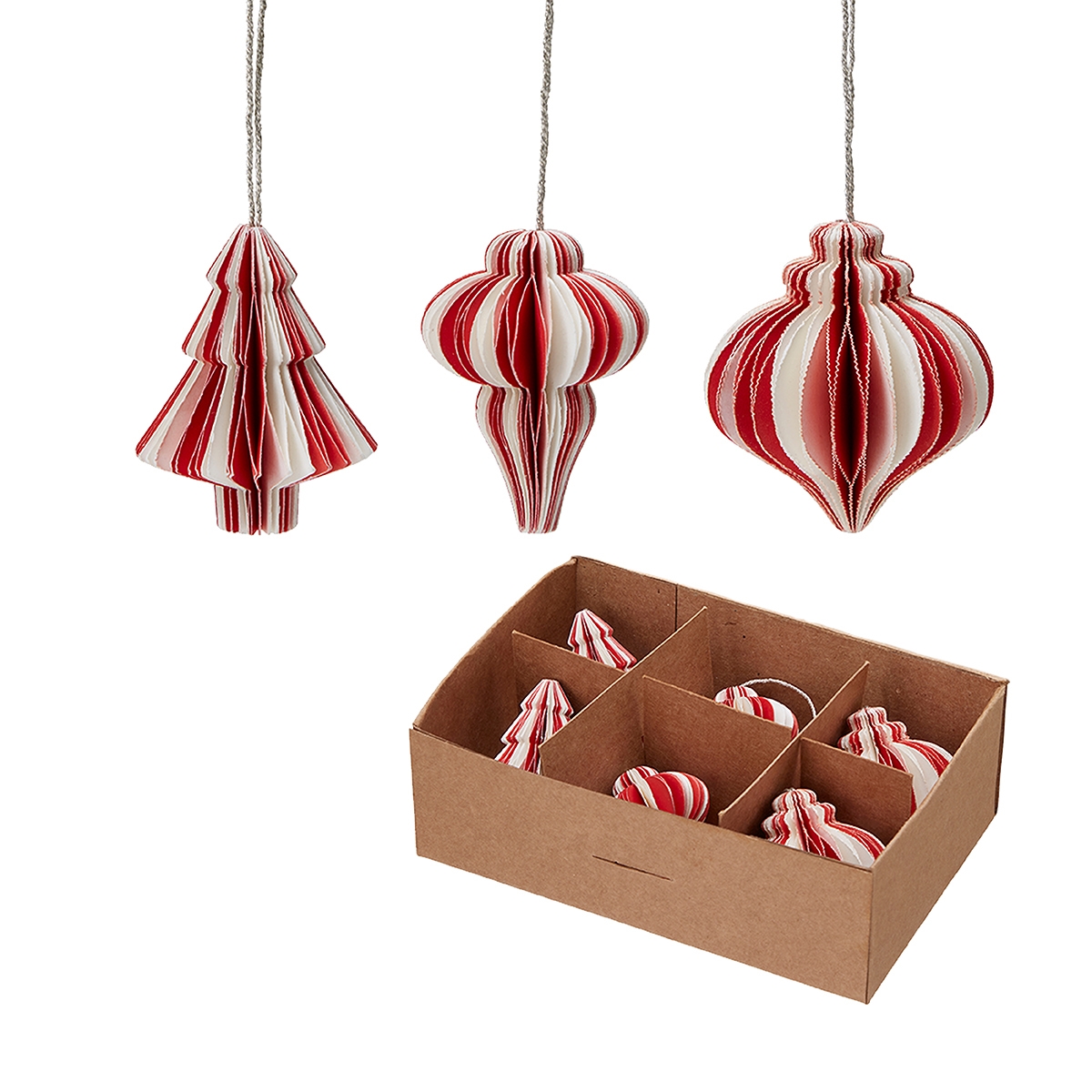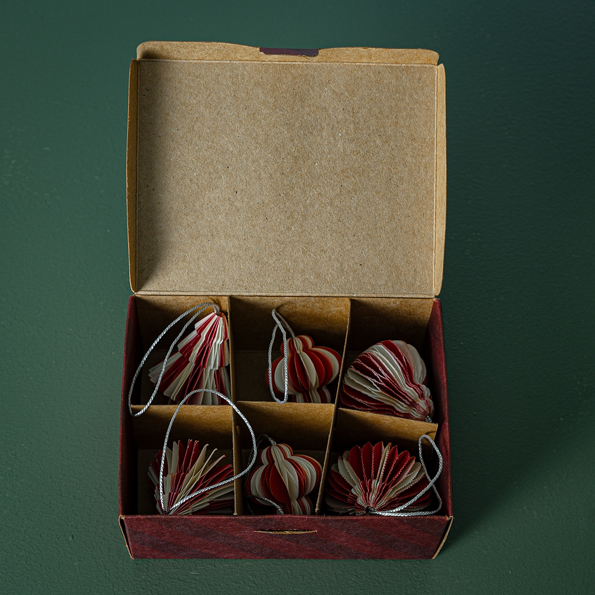 Pakke med 6 stk. fine Honeycomb ophæng fra Wikholm. Lavet i rigtige julefarver der har lidt cirkustema over sig.