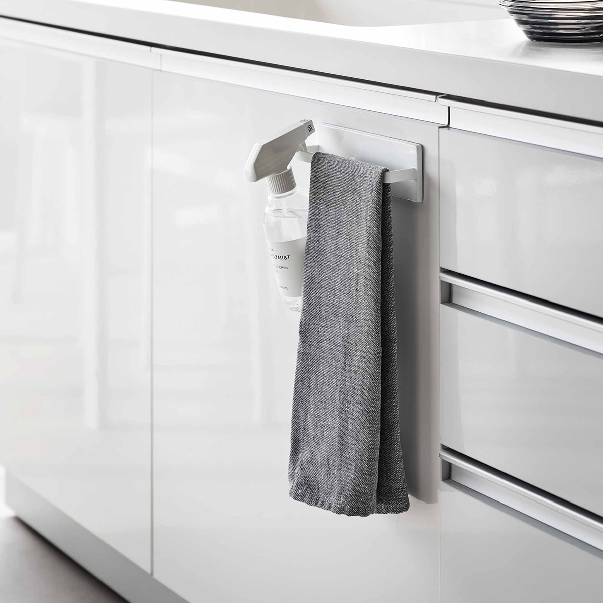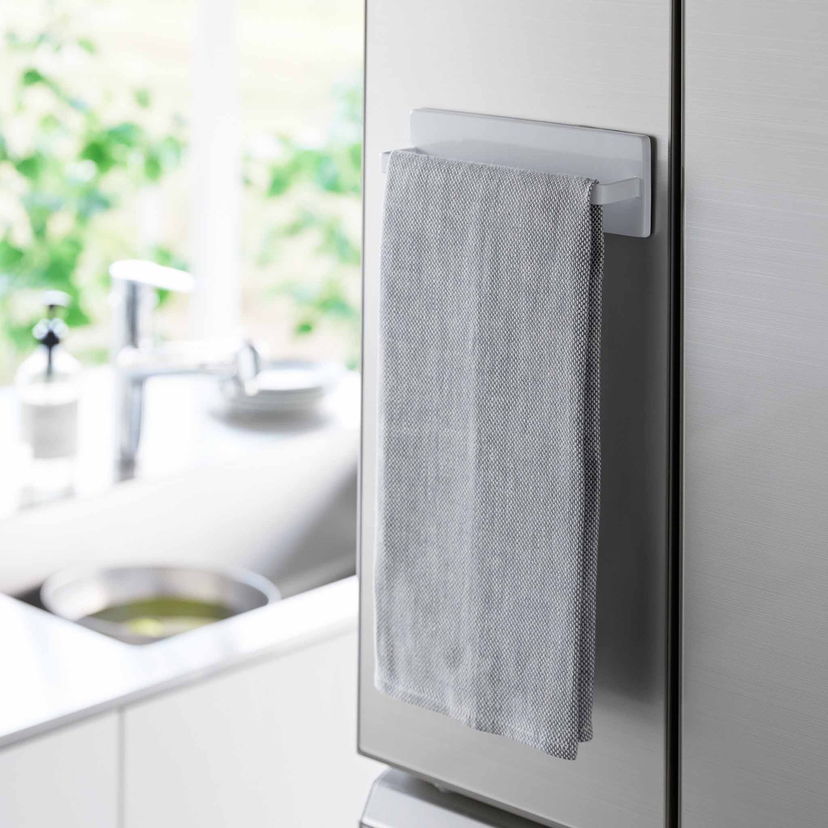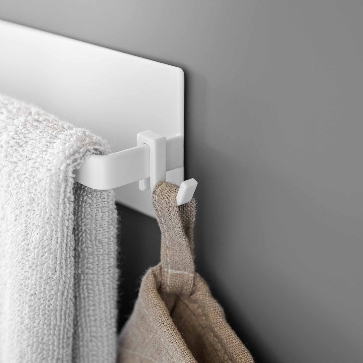 Yamazaki selvklæbende holder til viskestykker, gæstehåndklæder eller karklud. Denne i hvidt blankt metal