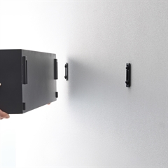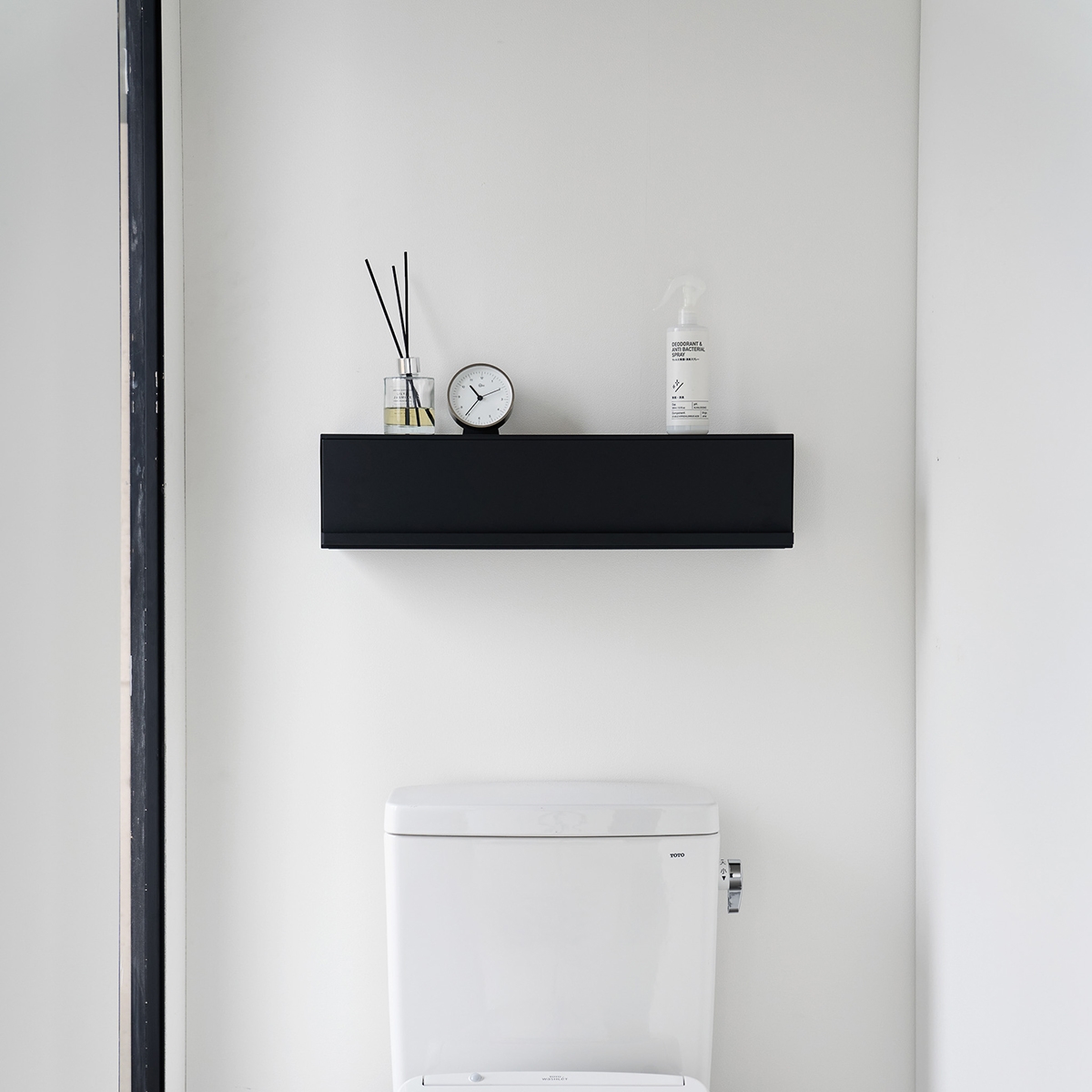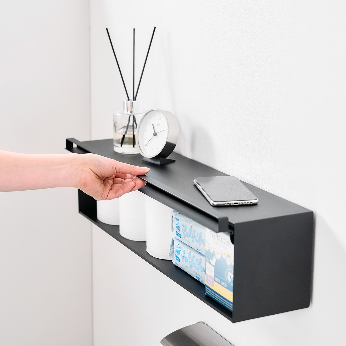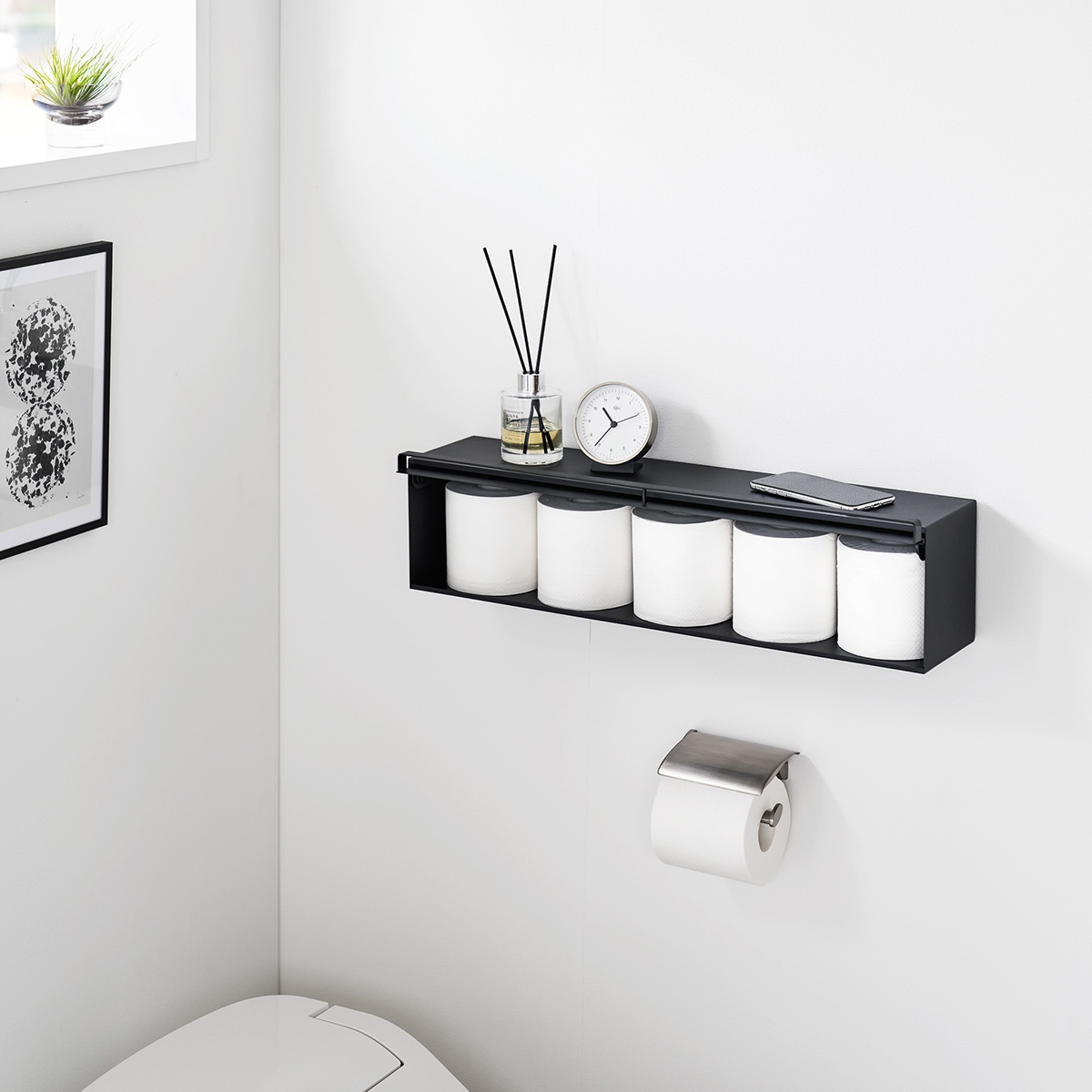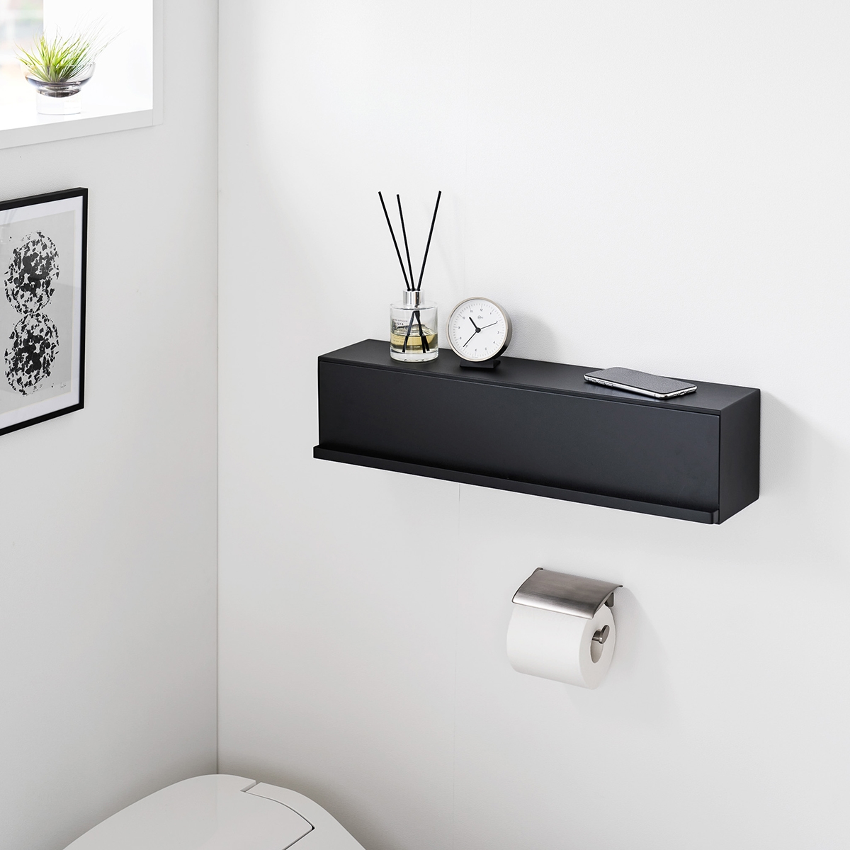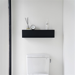 Yamazaki hylde med indbygget opbevaring. Hylden er beregnet til at hænge på væggen og skjule de ting, du samtidig ønsker indenfor rækkevidde. Her er plads til 5 ekstra toiletruller. Lågen åbner op ved at hive i håndtaget, og kører derefter ind under toppen af hylden. Så kan du bruge begge hænder til at tage ting fra hylden.