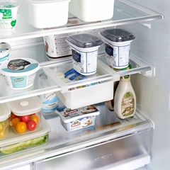 Hylde til at optimere pladsen i køleskabet. Du sætter hylden her fast på en eksisterende hylde i dit køleskab og får derved udnyttet pladsen optimalt. Bryg hylden til småting du gerne vil give en fast plads. Gær, smør, pålæg, medicin el lign.