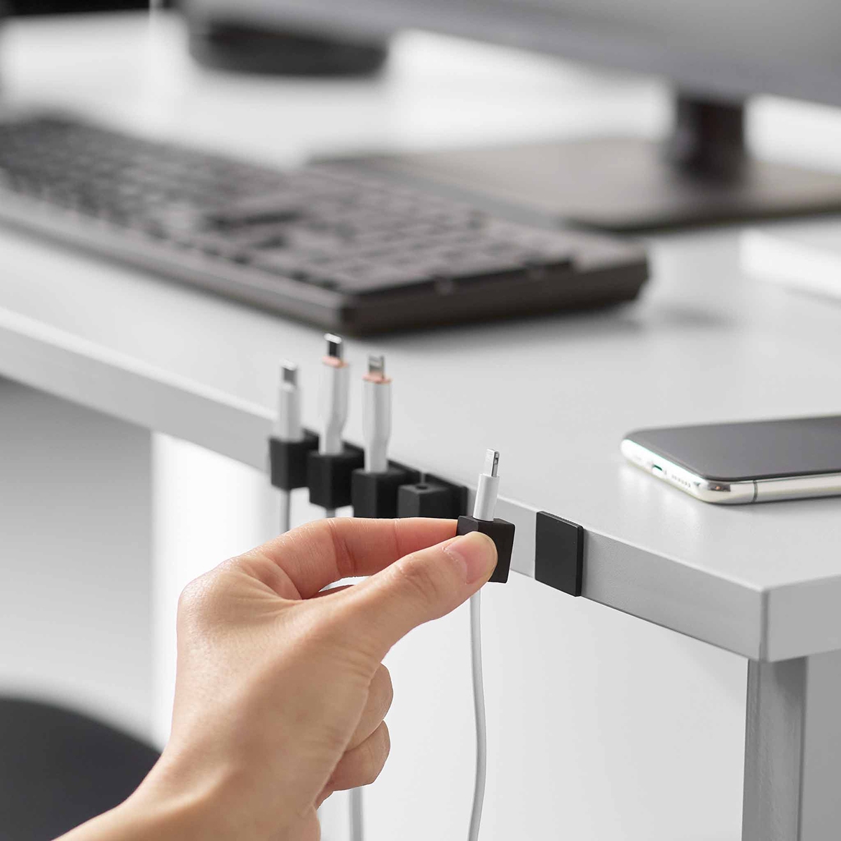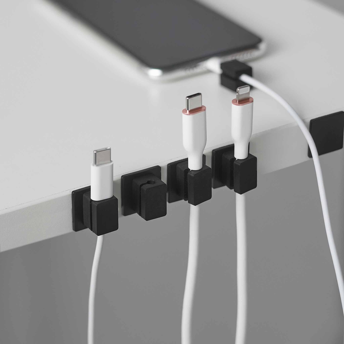 Pakke med fem kabelholdere, så du kan få styr på dine ledninger på kontorbordet eller i bilen.