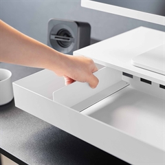 Skuffen har ventilationshuller bagpå, så den kan bruges til opladning af telefon, mus osv. Der medfølger to stk magnetiske kabelholdere. Skuffen har en inddeler, der kan flyttes efter behov.