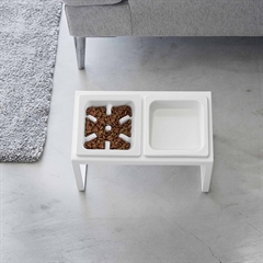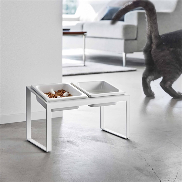 Foder og vand skålesæt til katte i hvid fra Yamazaki. Skålene er specielt udviklet til at få din kat til at spise langsommere, da der i madskålen er forhøjninger, der gør at katten skal arbejde lidt mere for at få maden op. Desuden står skålen tiltet skrå, så den derved får en mere behagelig spisestilling der minimerer opkast efter maden. Stellet er også 7 cm højere end det almindelige foderskålesæt.