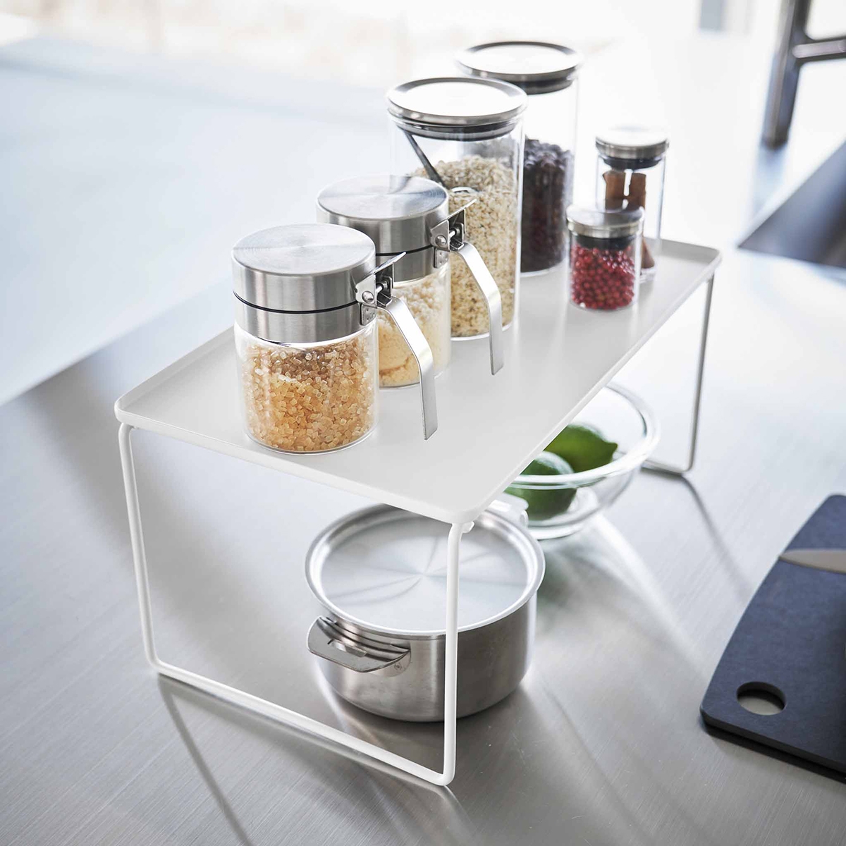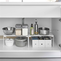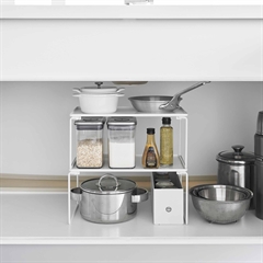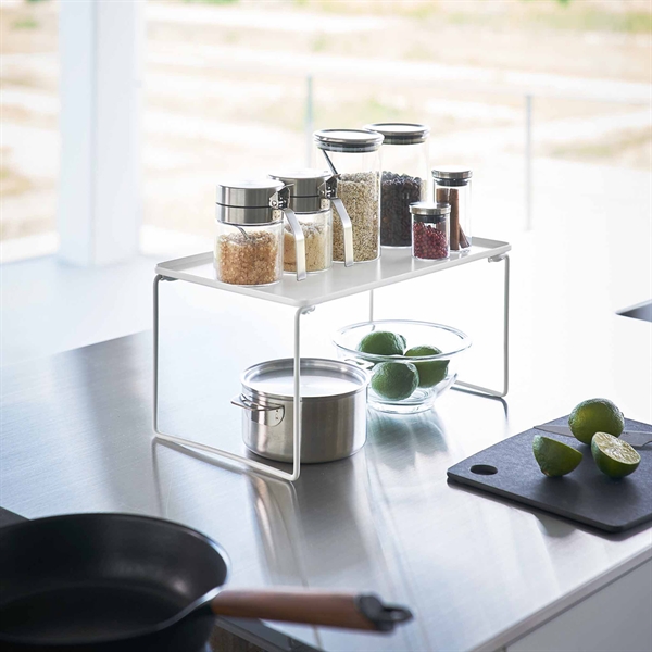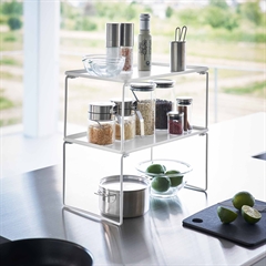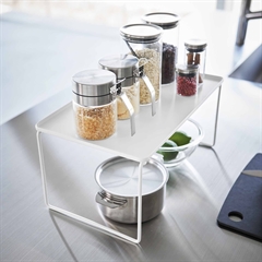 En smart hylde til at sætte på køkkenbordet for at maksimere opbevaringspladsen i køkkenet. Den har en lille kant, så ting ikke falder af.