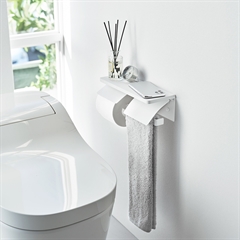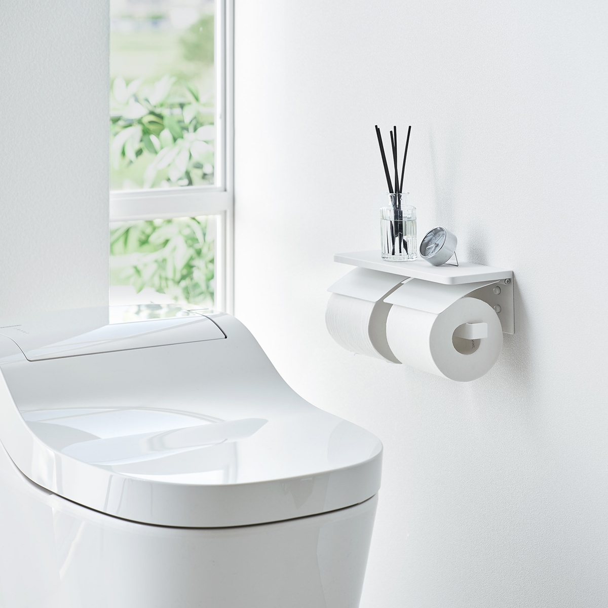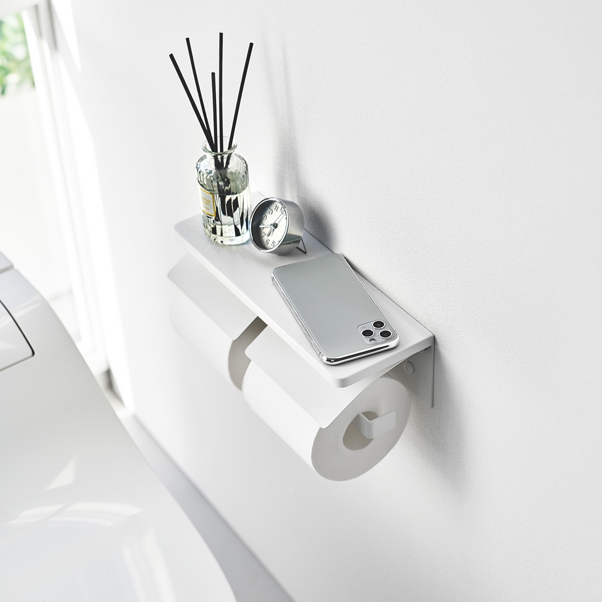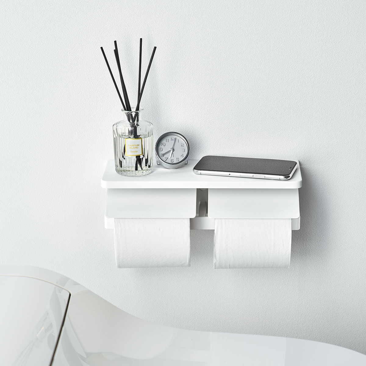 Yamazaki toiletrulleholder med hylde på toppen. Her i modellen til 2 toiletruller i hvid