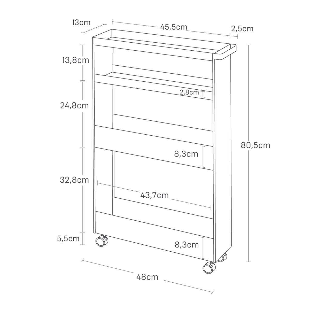 Det smalle design gør rullevognen ideel til opbevaring i mellemrummet mellem vaskemaskiner, det sidste stykke fra køleskabet og ind mod væggen, under bordet på badeværelset eller måske i bryggerset eller kontoret.