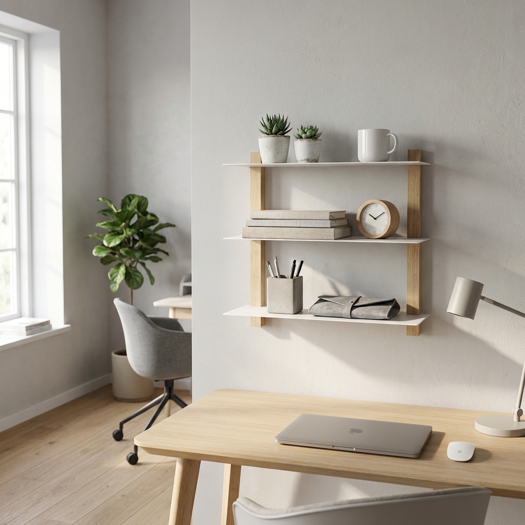 Hvid Yoshi reol til væggen med 3 hylder i metal og egetræ.