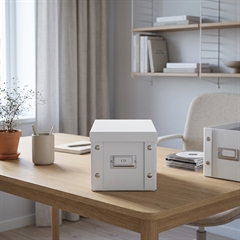 Æske i kraftigt pap fra Zeller. Æsken foldes nemt når du får den ved hjælp af trykknapper. Æsken har låg og forrest på enden sidder et mærke, så du kan skrive indholdet ned.