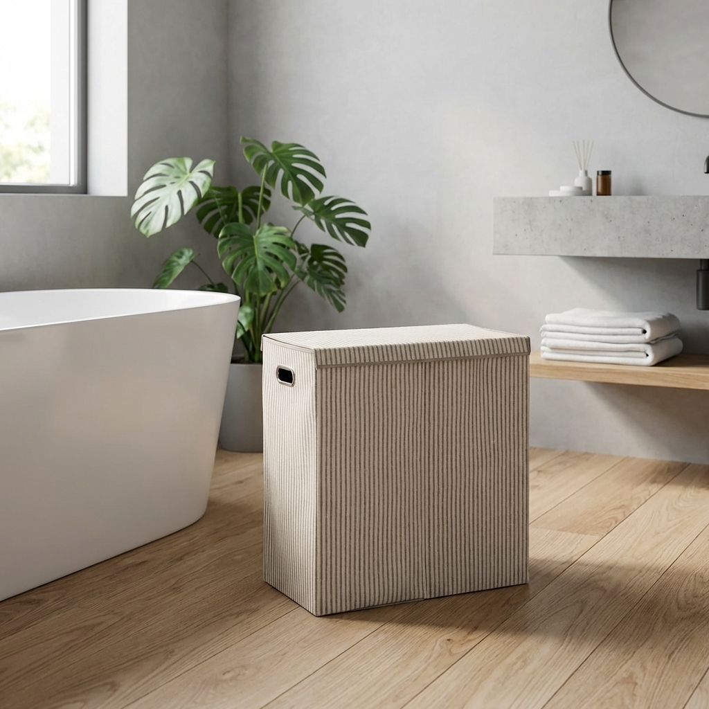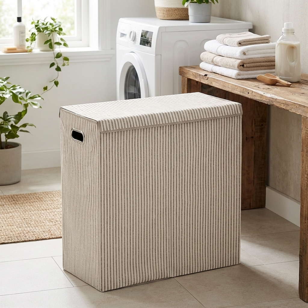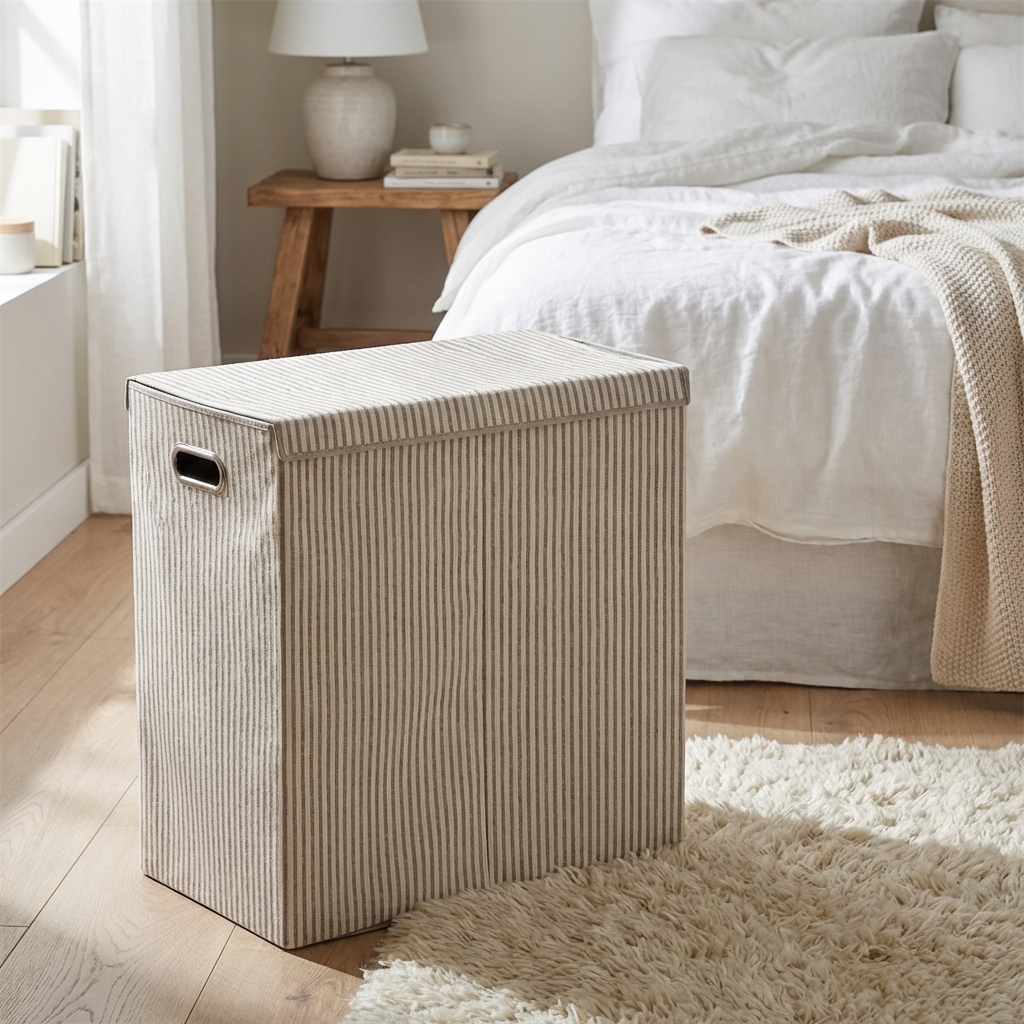 Dobbelt vasketøjskurv i stof.