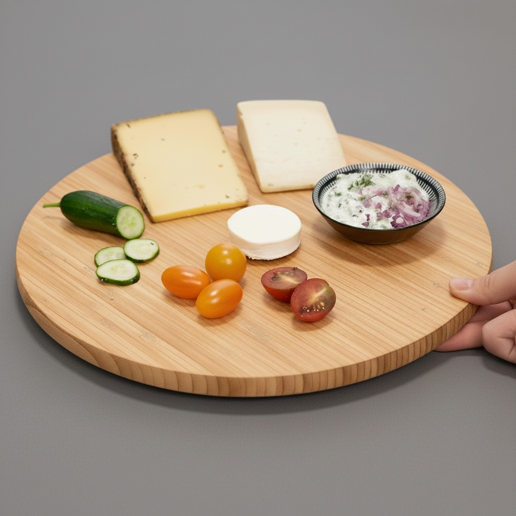 Drejefadet i bambus har også en god størrelse til brug som serveringsfad.