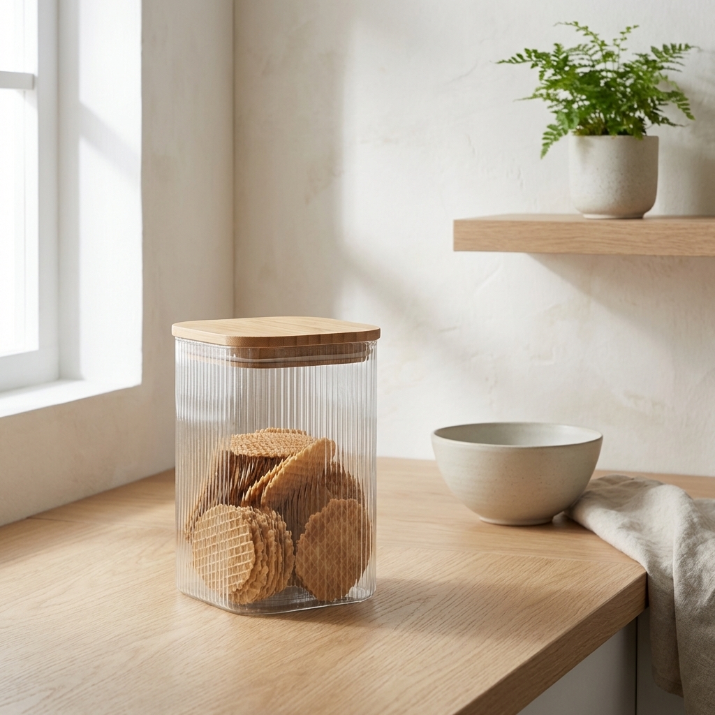 Firkantet glaskrukke til opbevaring af fødevarer i køkkenet.