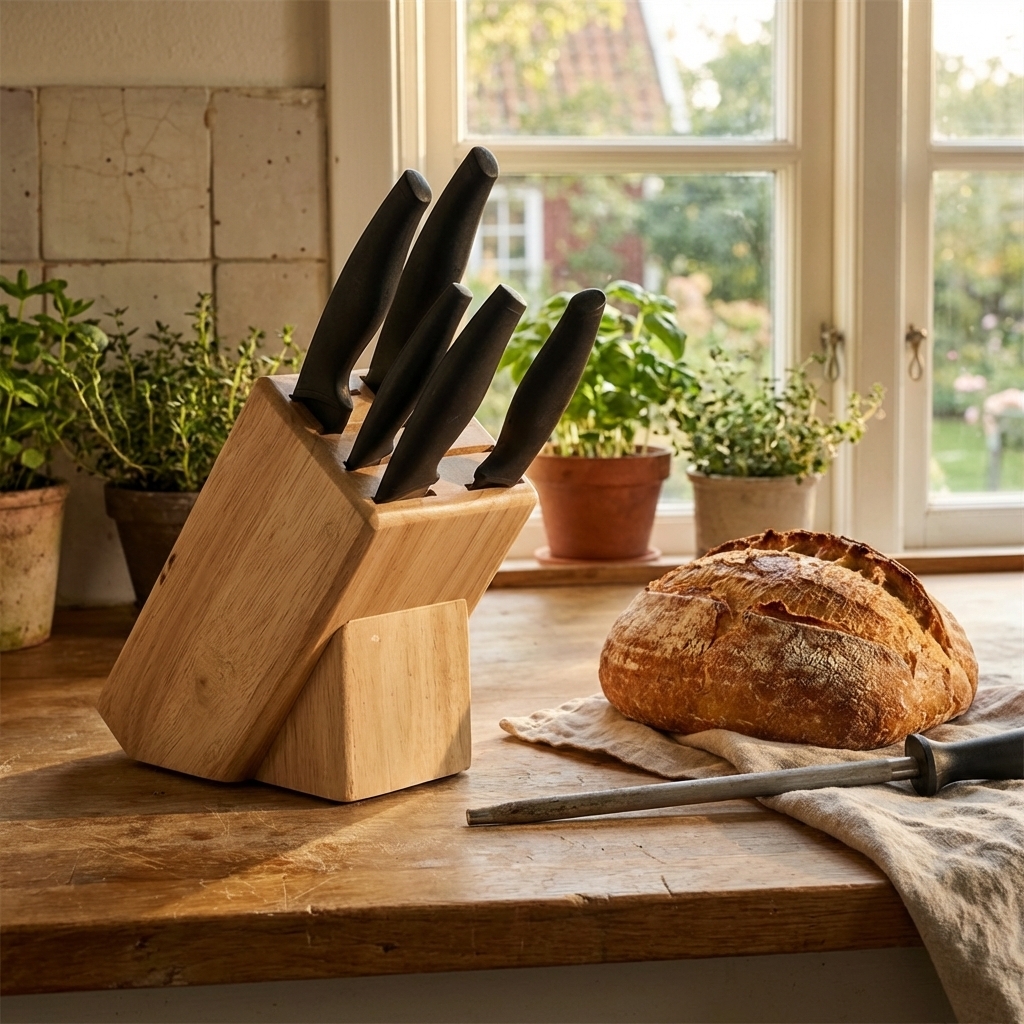 Knivblok til køkkenbordet lavet i gummitræ.