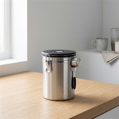 Dåsen er lavet i rustfrit stål med et lufttæt låg. På siden af dåsen er der lavet en holder til den medfølgende ske så du let kan dosere din kaffe om det er hele bønner, kværnede bønner eller instant kaffe.