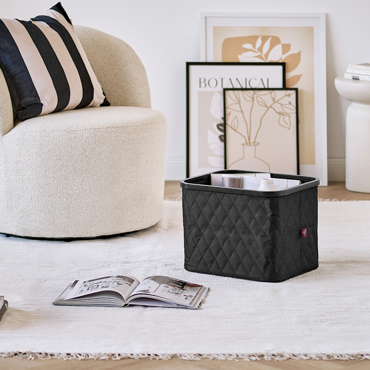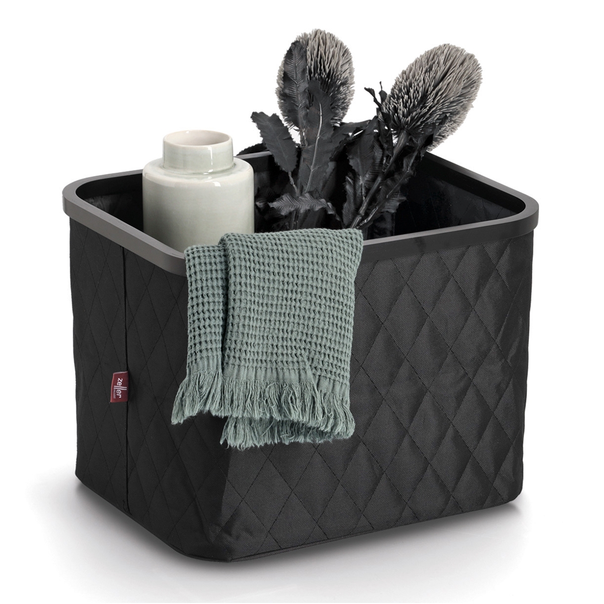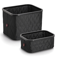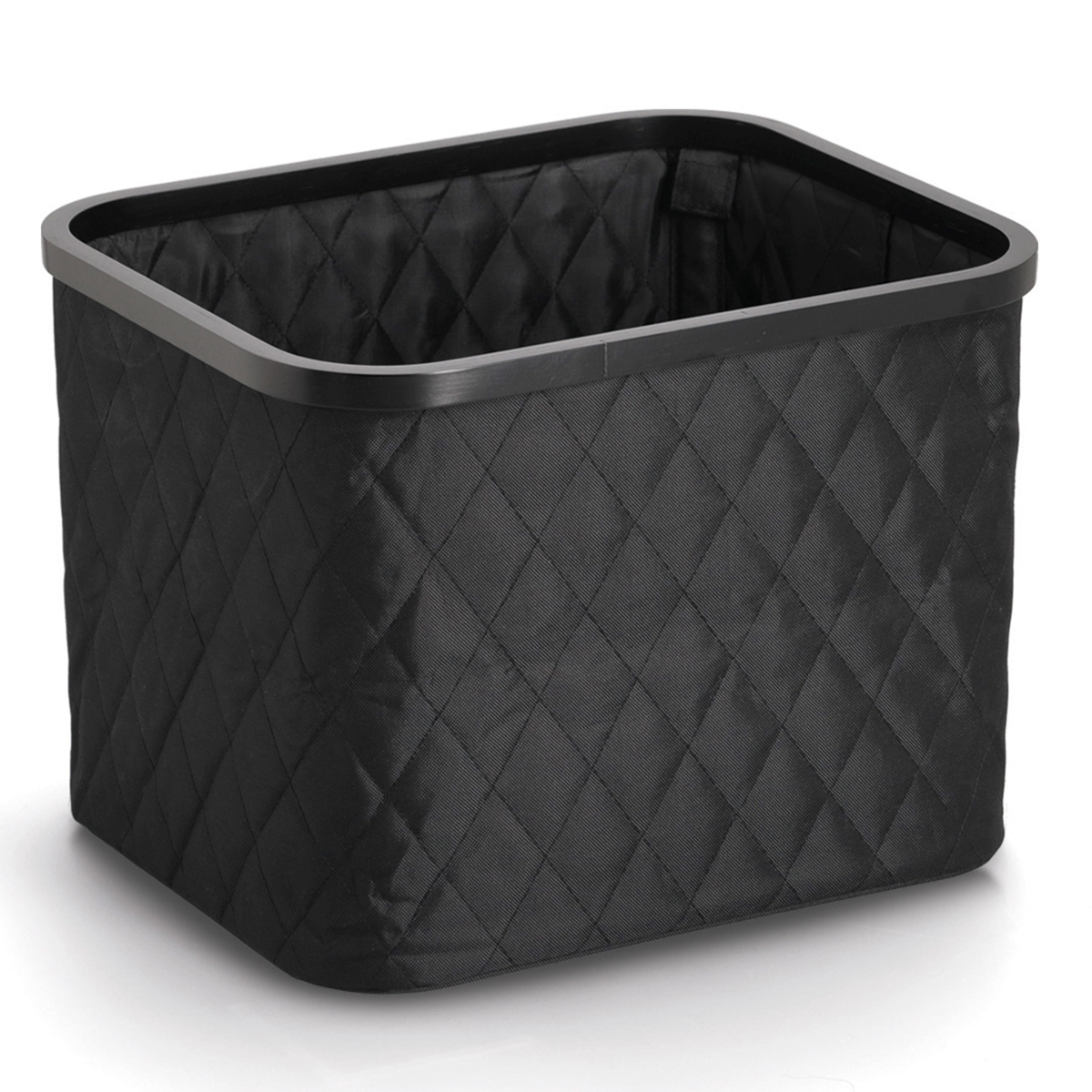 Stilren opbevaringskurv lavet i sort polyester og bambus i et quilt mønster.