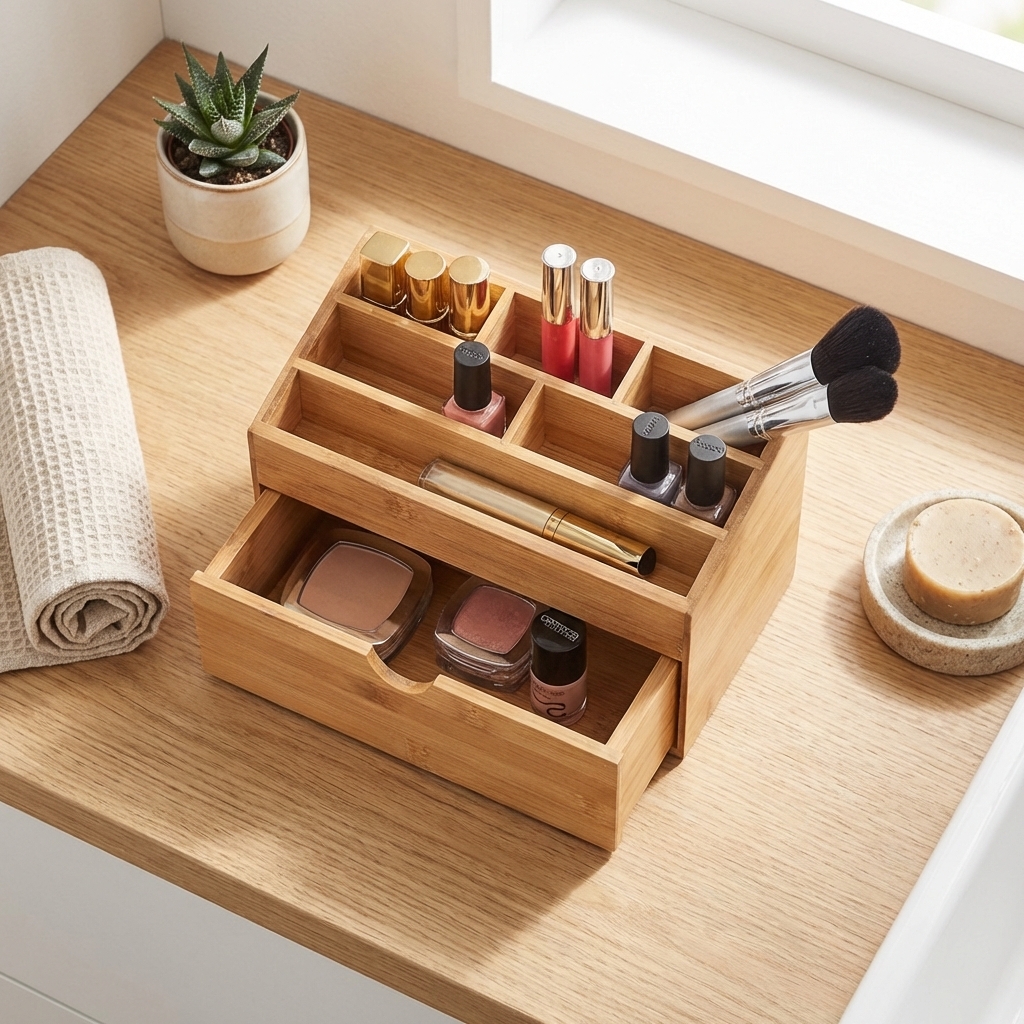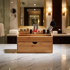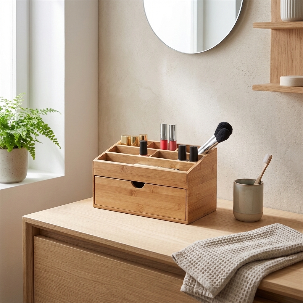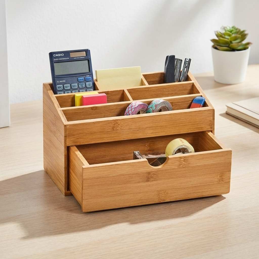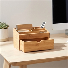 Multifunktionel organizer med skuffe til hjemmet - lavet i bambus.
