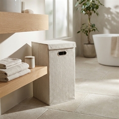 Enkel vasketøjskurv i non-wowen stof i polyester omkring en kerne af kraftigt pap.