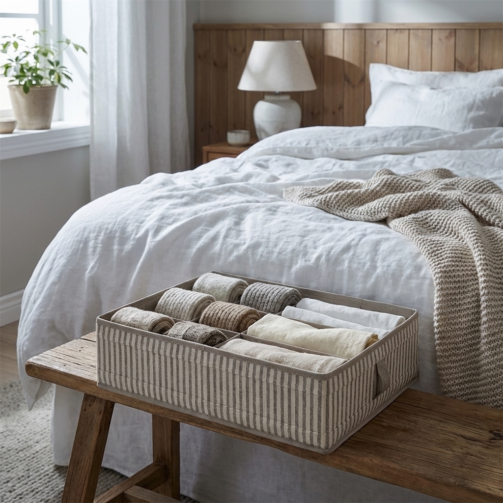 Kasse i stof med 12 rum til små stykker tøj som undertøj, strømper og slips.