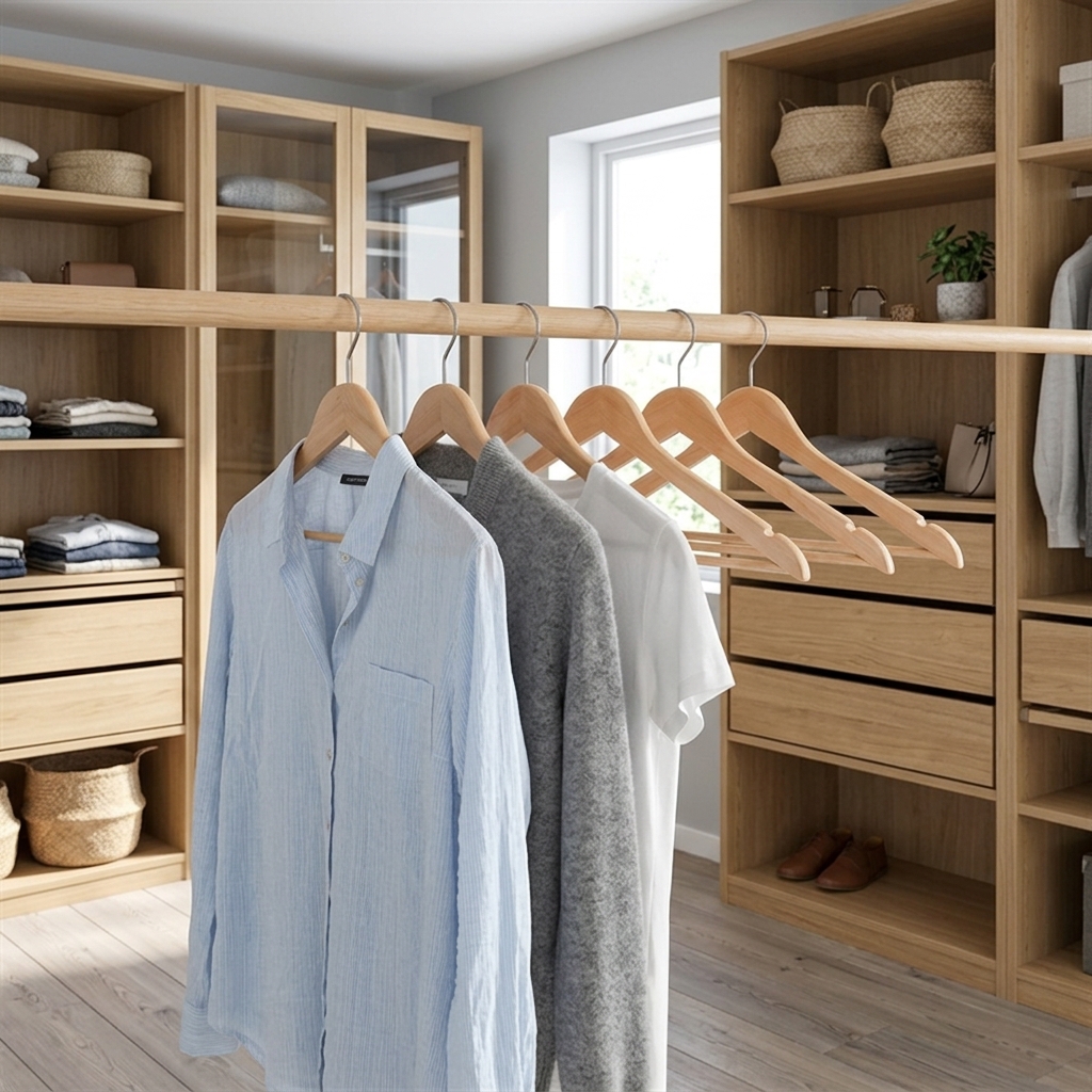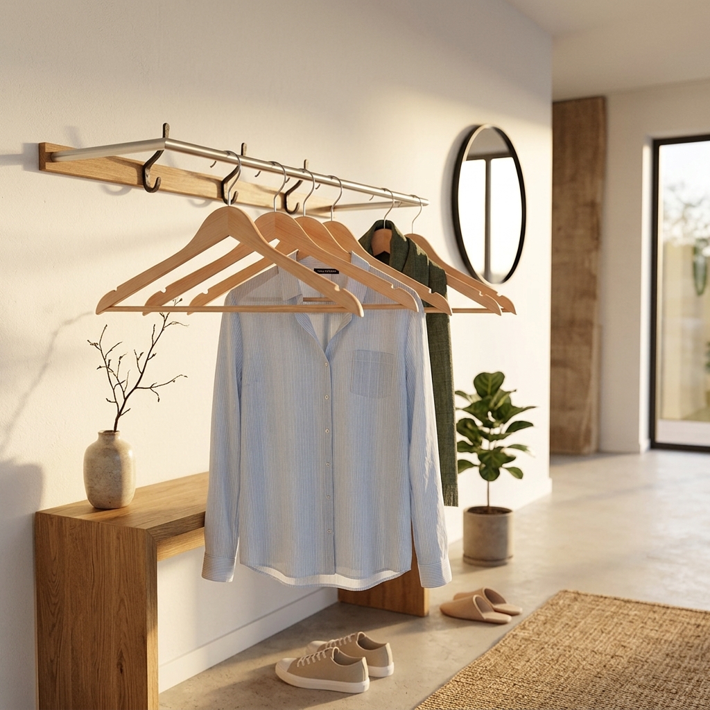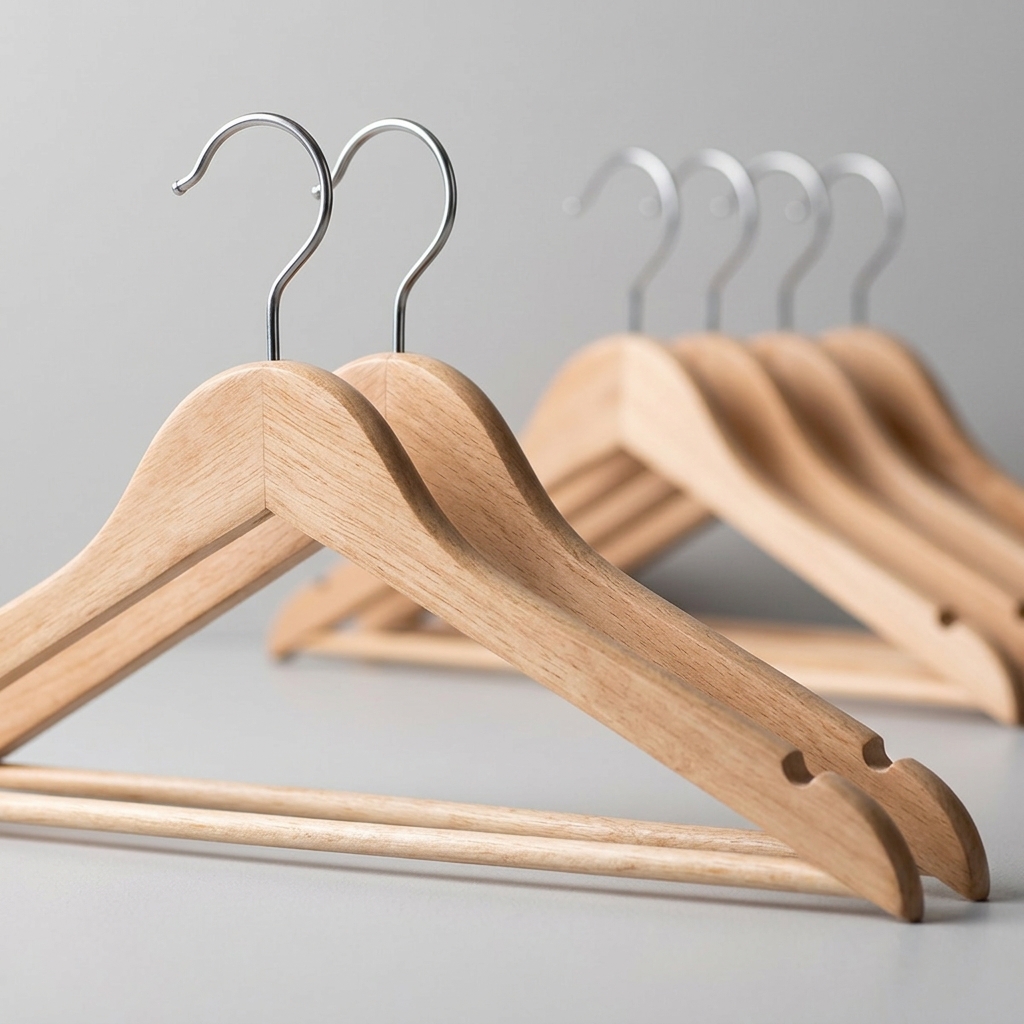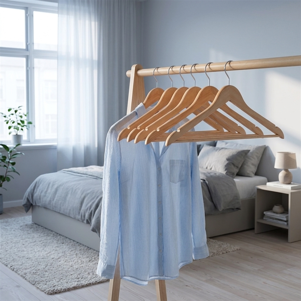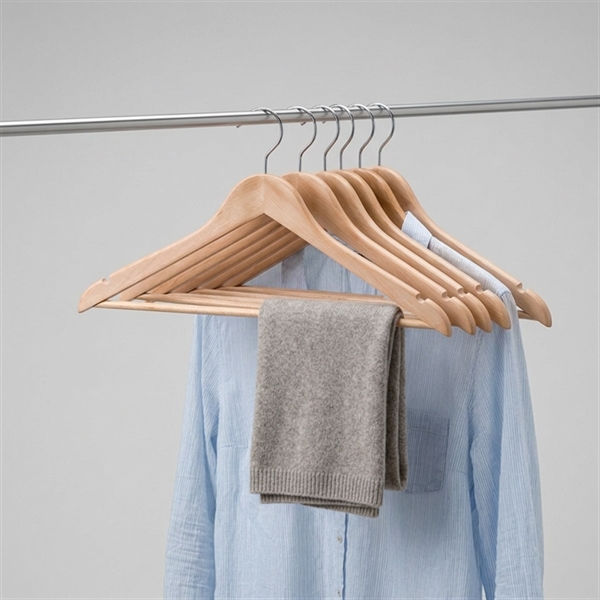 Bøjlerne er lavet af træ med en metaltop.Klassiske tøjbøjler i træ til en organiseret garderobe.
