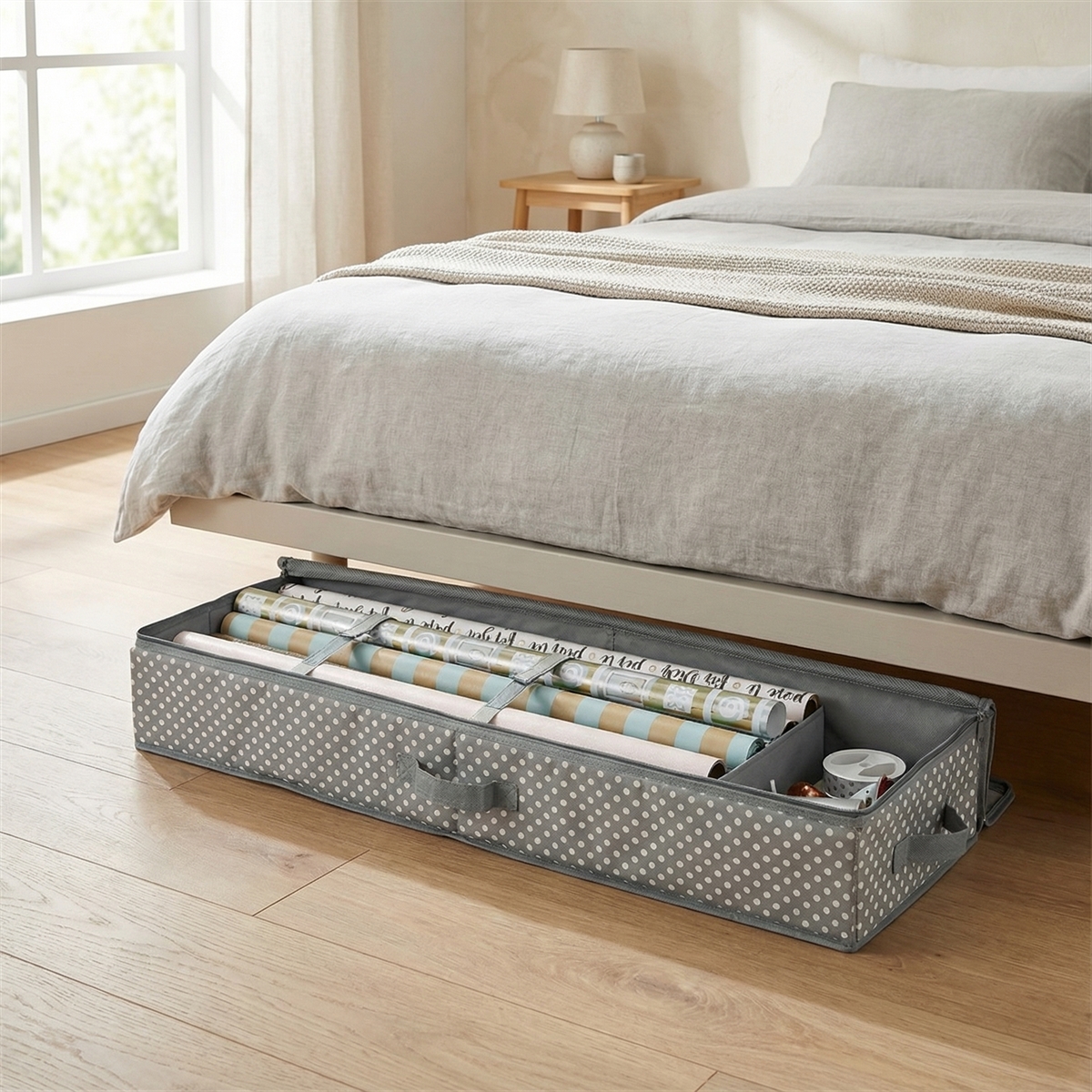 Under-bed storage stofkurv i grå med prikker til opbevaring af gavepapir og tilbehør.